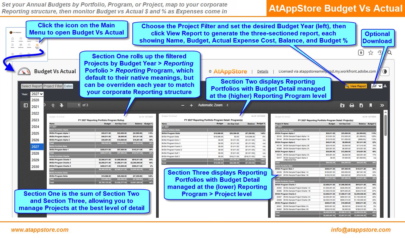 Our Budget vs Actual solution lets you set set Annual Budgets by Portfolio, Program, or Project, map to your corporate Reporting structure, then monitor Budget vs Actual $ and % as Expenses come in.