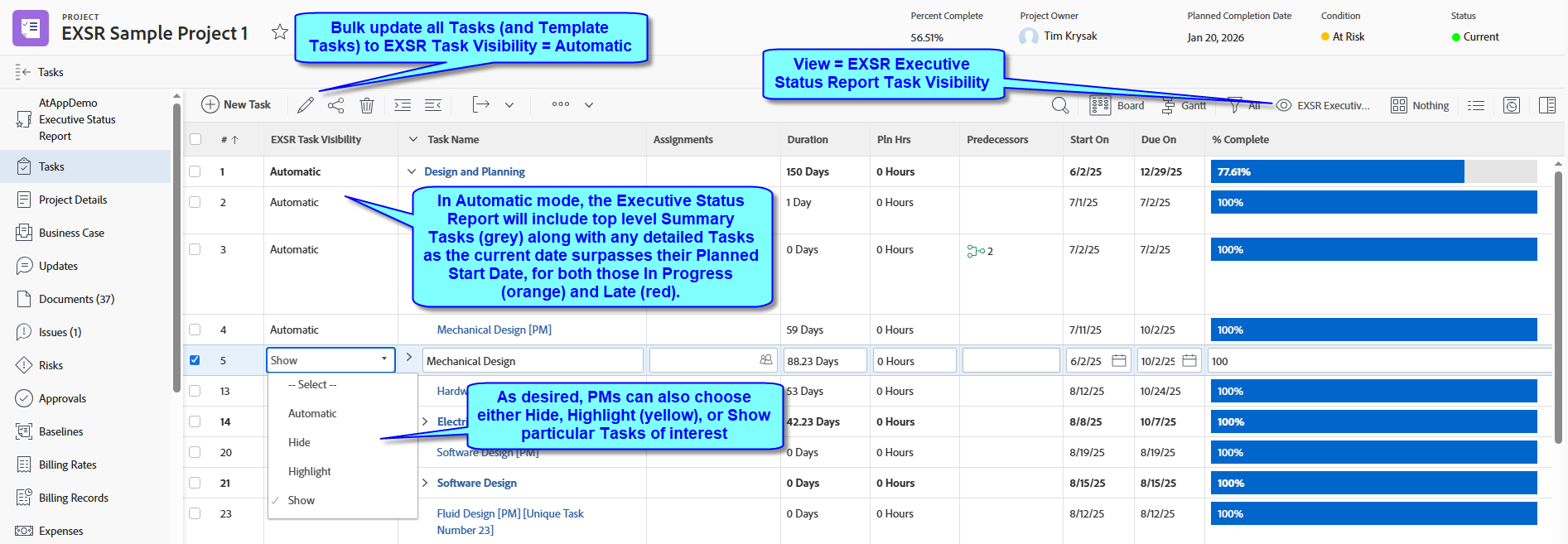 Our Executive Status Report can save an enormous amount of (precious) project management time: no double entry, no exporting data to Excel and then reformatting in PowerPoint, and no lag in the message. Instead, it’s review the plan, update a few comments, take the Snapshot, toggle the most relevant tasks, and view the results: ready for discussion, printing, or emailing.
